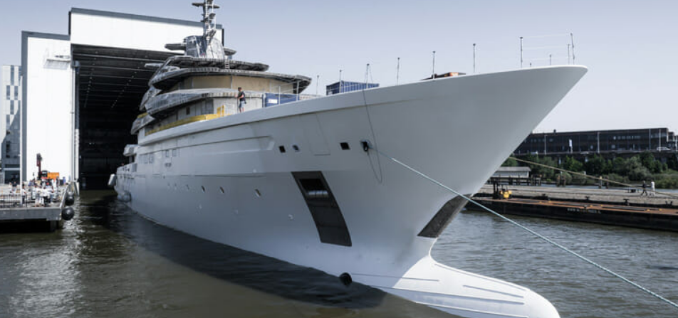 The yacht Shackleton, a.k.a. Project Icecap, has kept a super-low profile since sea trials in 2022. 351 feet (107 meters). Construction and outfitting have been at Penne-Werft, a naval facility belonging to Lürssen. Fittingly for that setting, the yacht has an inverted bow, for taking on tough seas. A total of 20 in the owner’s party can stay aboard this explorer, one of the biggest such builds seeing delivery this year. Her volume is significant, too, upwards of 6,500 gross tons. (On a related note, some media report that REV Ocean will be the world’s largest explorer yacht when handed over this year. However, that vessel is not a yacht. It’s a research ship for raising awareness of global impacts on the marine environment. Some yacht-like amenities are amid laboratories and other science-focused rooms.)